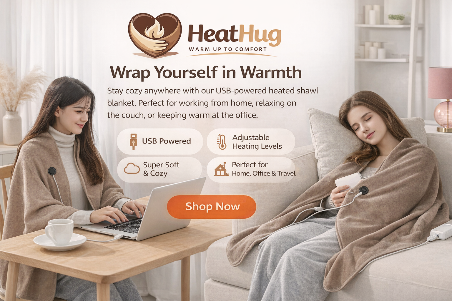 HeatHug is a USB-powered heated shawl blanket designed to keep you warm and comfortable anywhere. It combines softness, warmth, and portability, making it perfect for home, office, or travel use.